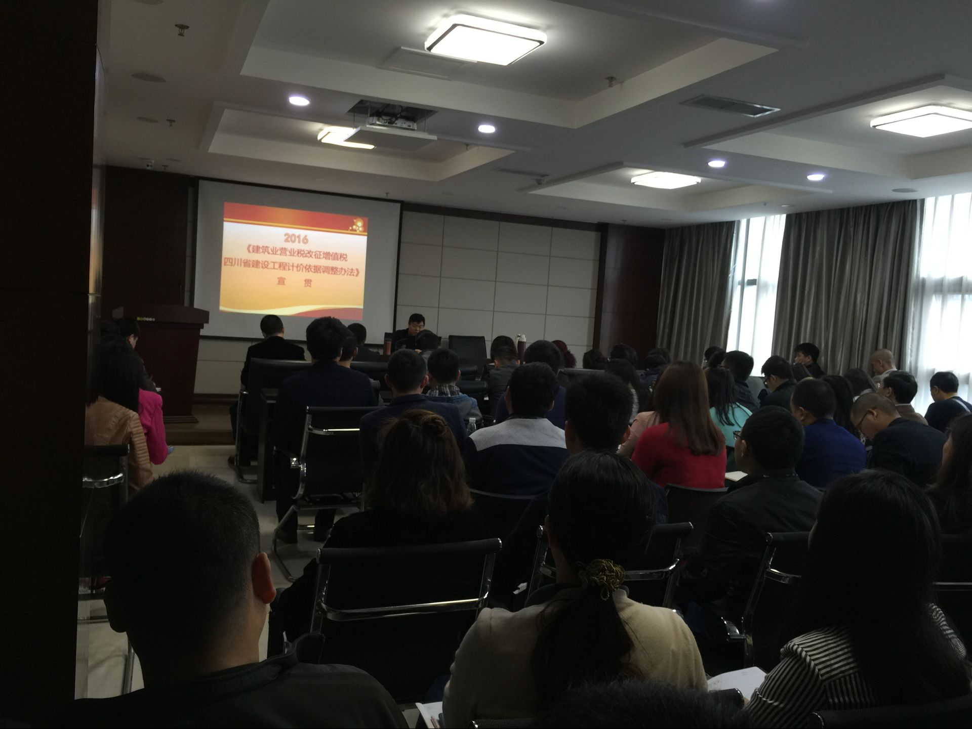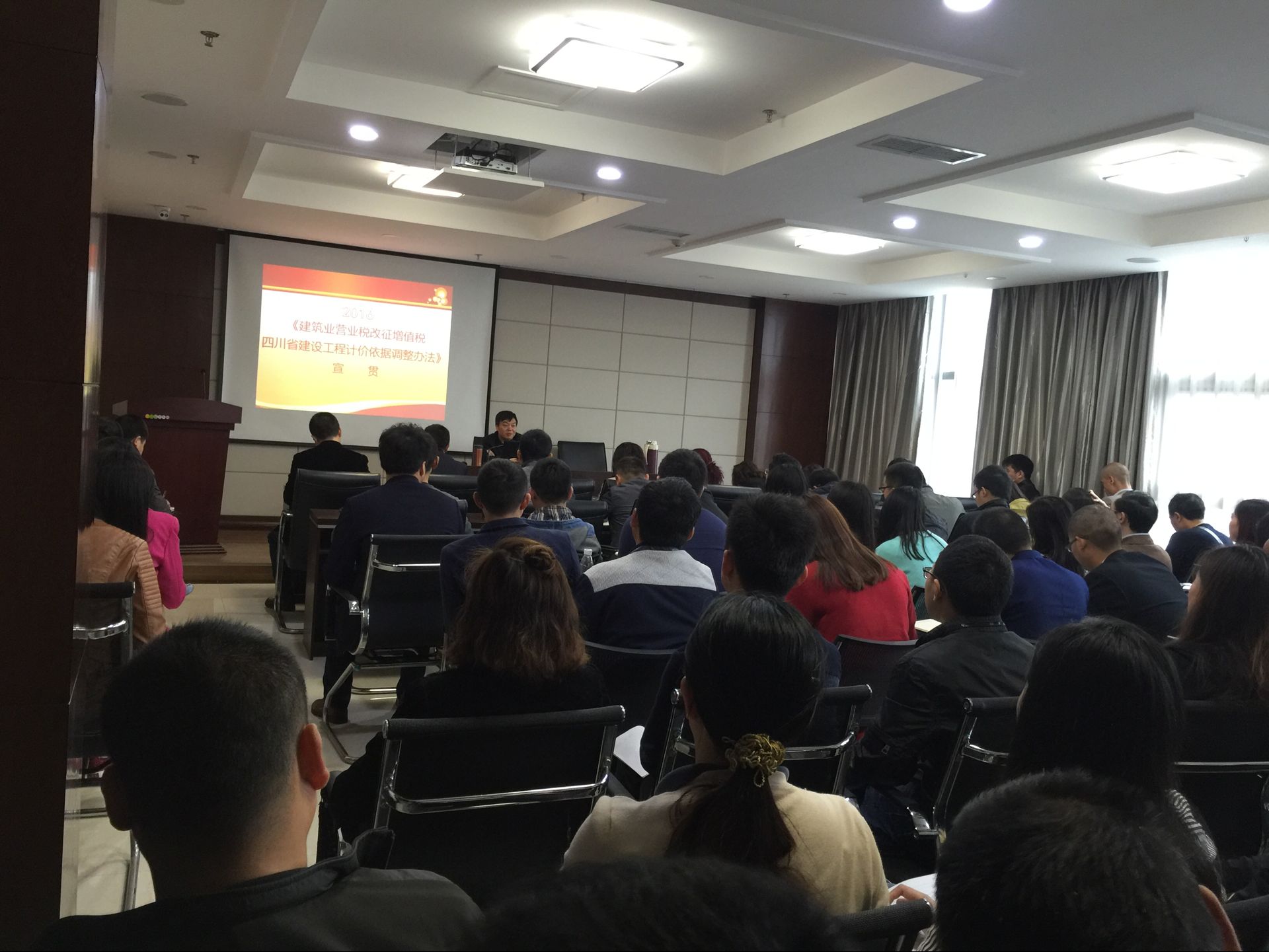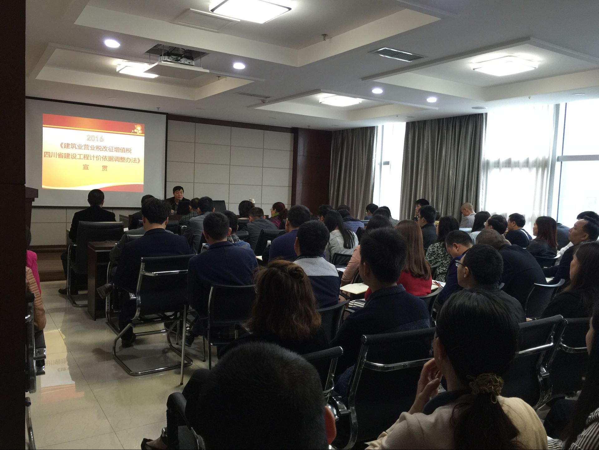 根據(jù)《四川省住房和城鄉(xiāng)建設(shè)廳關(guān)于印發(fā)<四川建筑業(yè)營(yíng)業(yè)稅改征增值稅四川省建設(shè)工程計(jì)價(jià)依據(jù)調(diào)整辦法>的通知》(川建造價(jià)發(fā)[2016]349號(hào))有關(guān)要求,為適應(yīng)國(guó)家稅制改革要求,滿足建筑業(yè)營(yíng)改增后建設(shè)工程計(jì)價(jià)需要,切實(shí)保障建筑業(yè)營(yíng)改增順利實(shí)施,便于工程造價(jià)管理機(jī)構(gòu)及施工、工程造價(jià)咨詢企業(yè)對(duì)建筑業(yè)“營(yíng)改增”政策及配套措施的理解,我公司邀請(qǐng)專(zhuān)業(yè)技術(shù)領(lǐng)導(dǎo)來(lái)我單位舉辦 “營(yíng)改增”專(zhuān)題學(xué)習(xí)會(huì)。