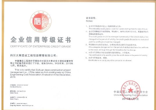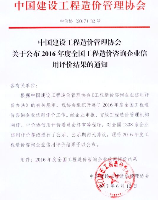 中國建設工程造價協(xié)會開展了2016年度全國造價咨詢企業(yè)信用評價工作。中價協(xié)信用評價委員會終審,評價等級確定為AAA.AAA-、AA.AA-、A五個等級。我公司評定為AAA級。