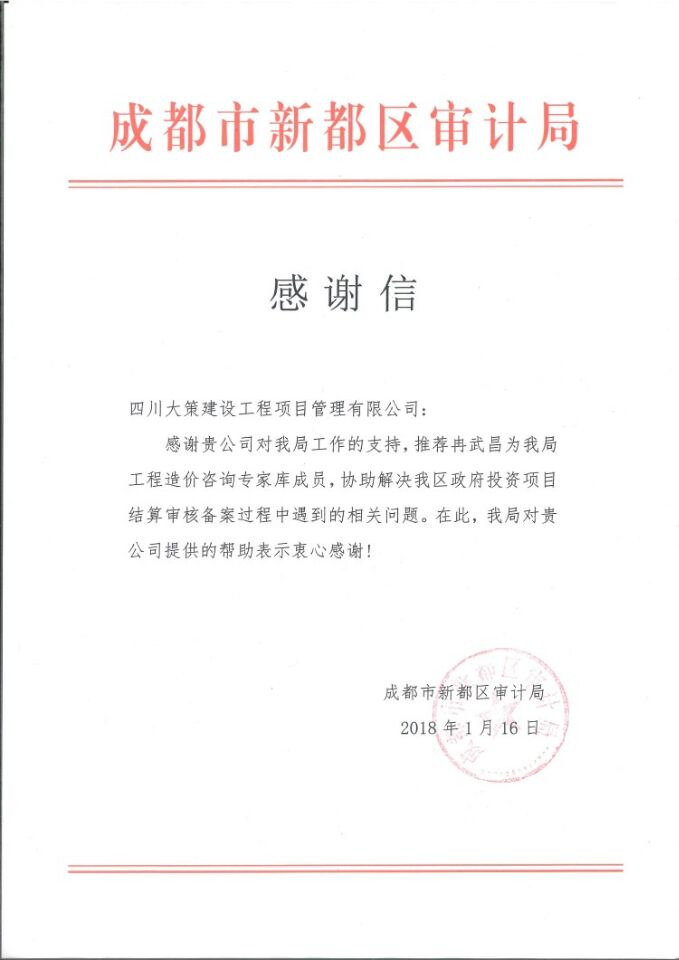 成都市新都審計(jì)局對(duì)我公司的業(yè)務(wù)水平有著很高的評(píng)價(jià),特推薦我公司一部經(jīng)理冉武昌為貴局工程造價(jià)專(zhuān)家?guī)斐蓡T,協(xié)助解決新都區(qū)政府投資項(xiàng)目結(jié)算審核備案過(guò)程中的相關(guān)問(wèn)題。感謝新都審計(jì)局的信任與厚愛(ài),我們會(huì)報(bào)以?xún)?yōu)秀的工作成果。