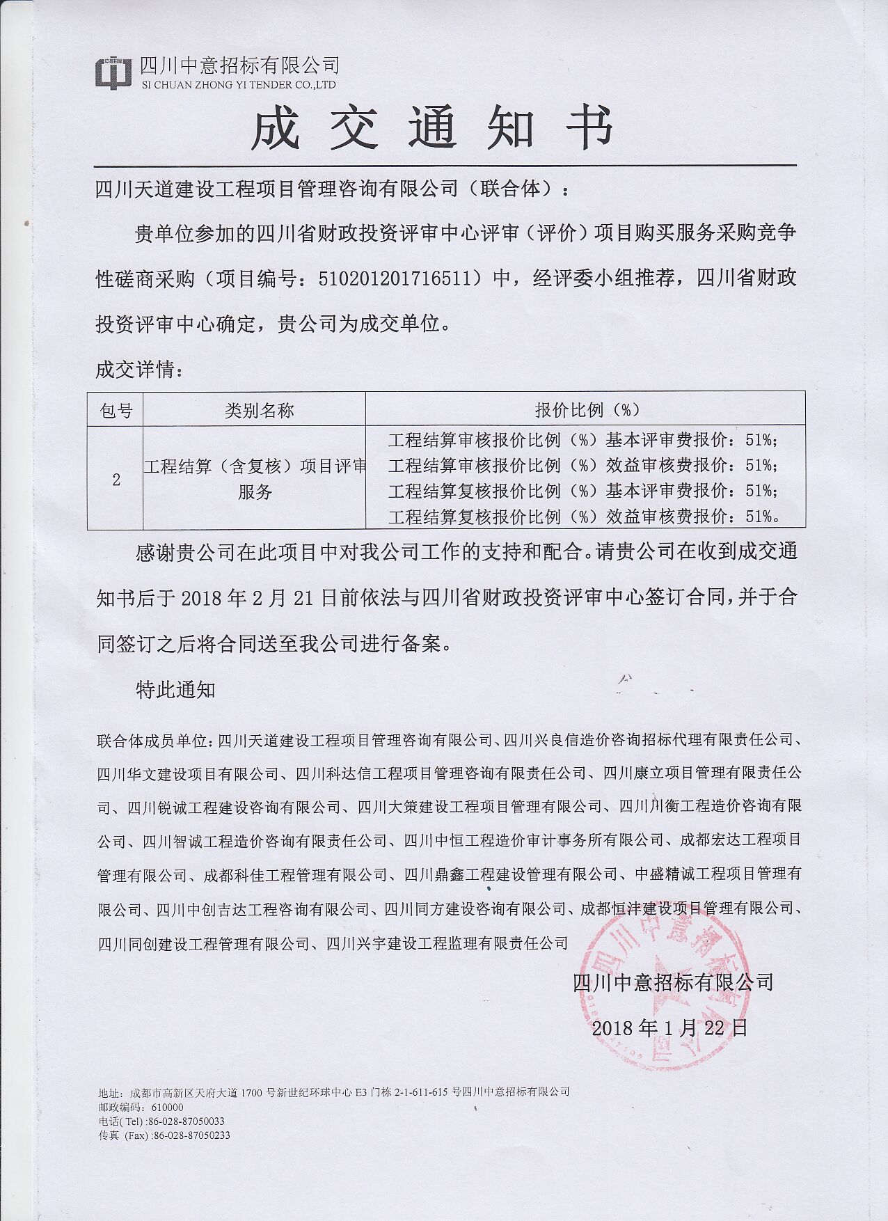 在我公司參加的四川省財(cái)政投資評審項(xiàng)目采購競爭性磋商采購中,經(jīng)評委小組推薦,我公司為成交單位。